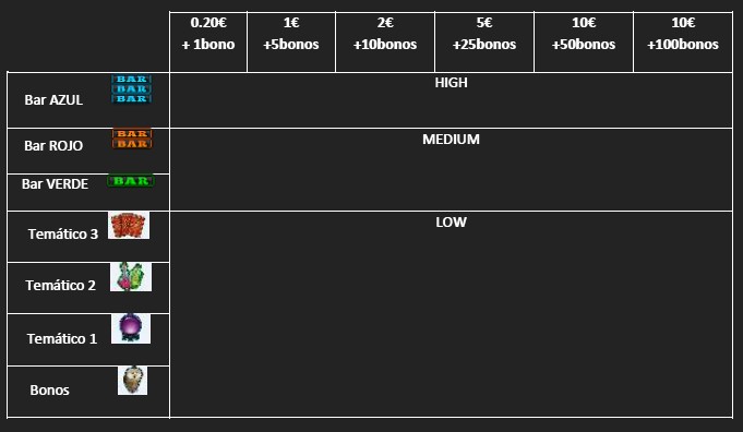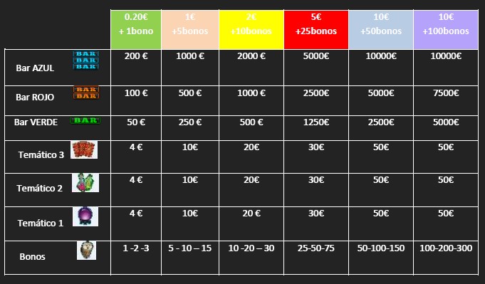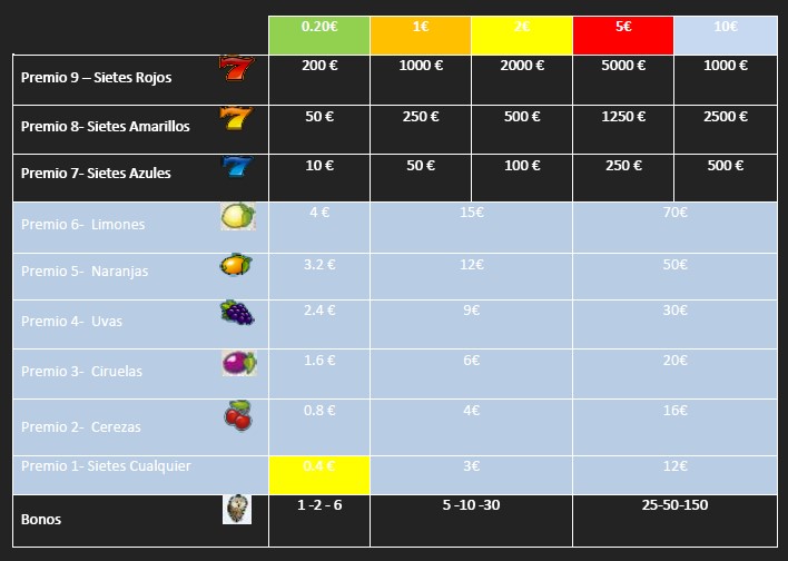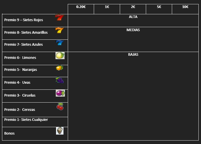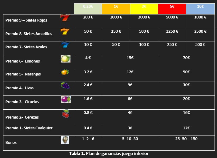 Dependiendo de la combinación resultante en la línea central, el jugador obtendrá un premio según el siguiente plan de ganancias. Las apuestas serán configurables por el operador, las activas tendrán este plan de ganancias: