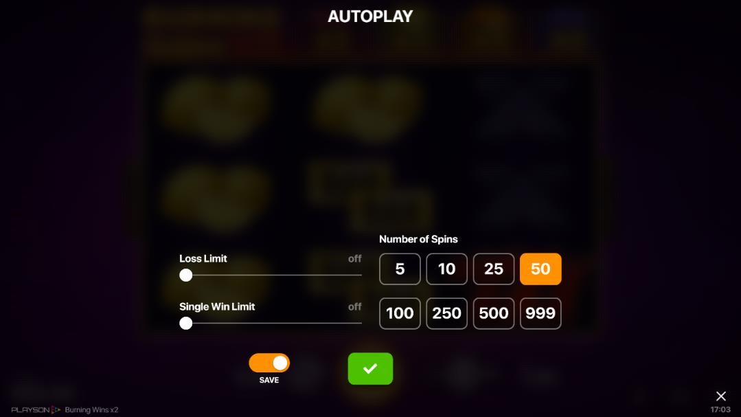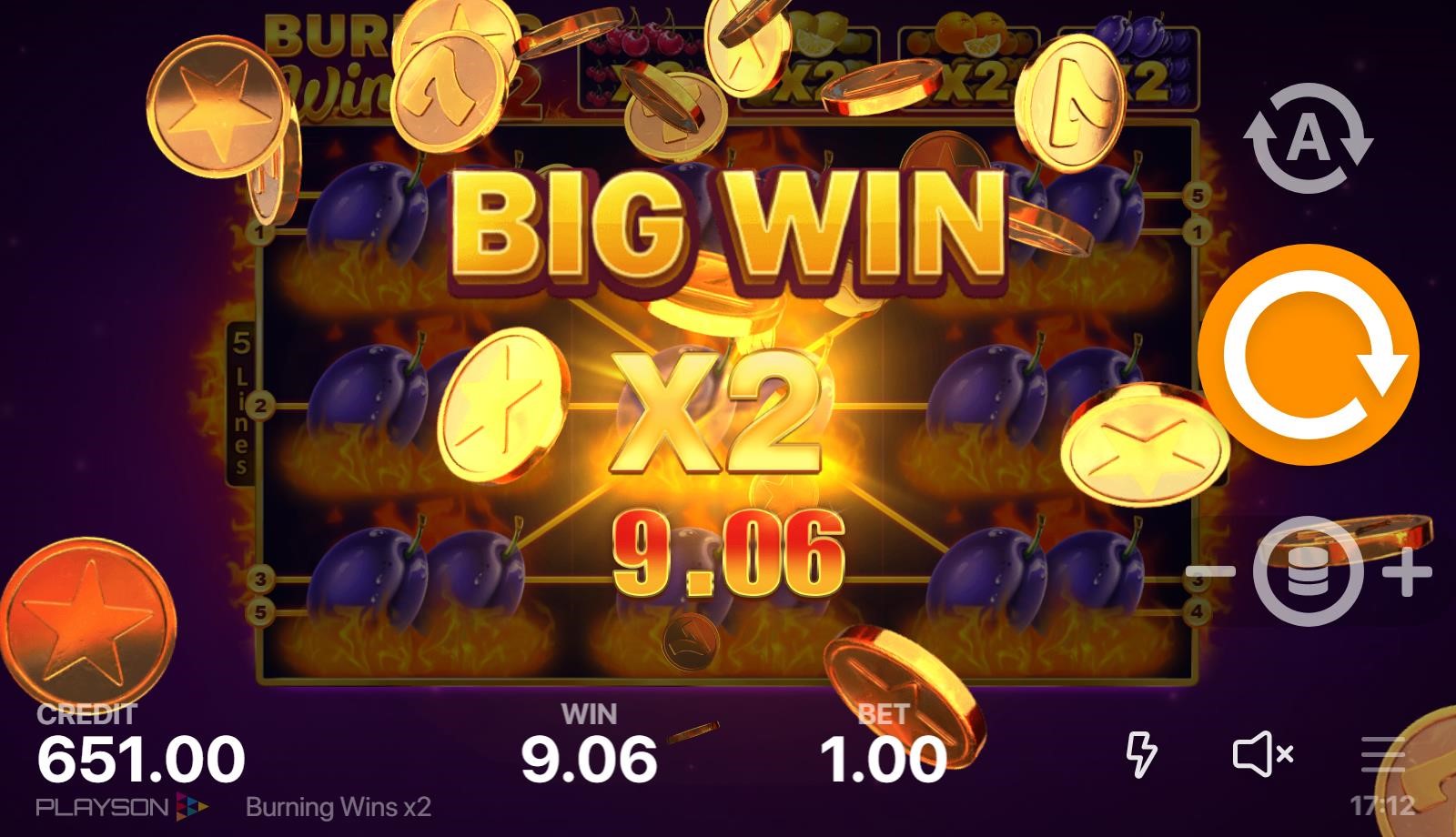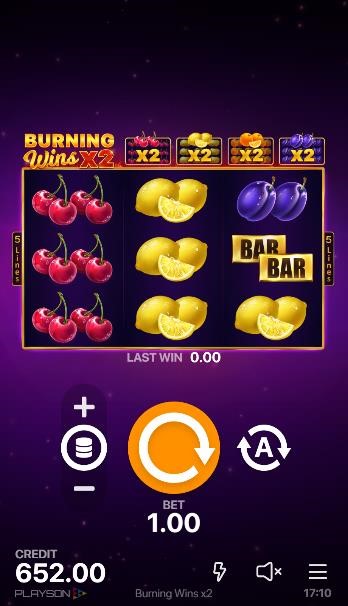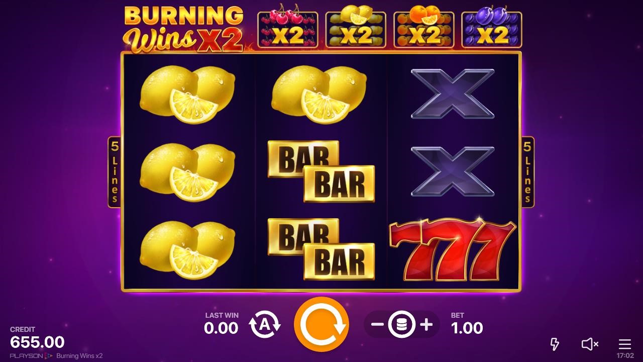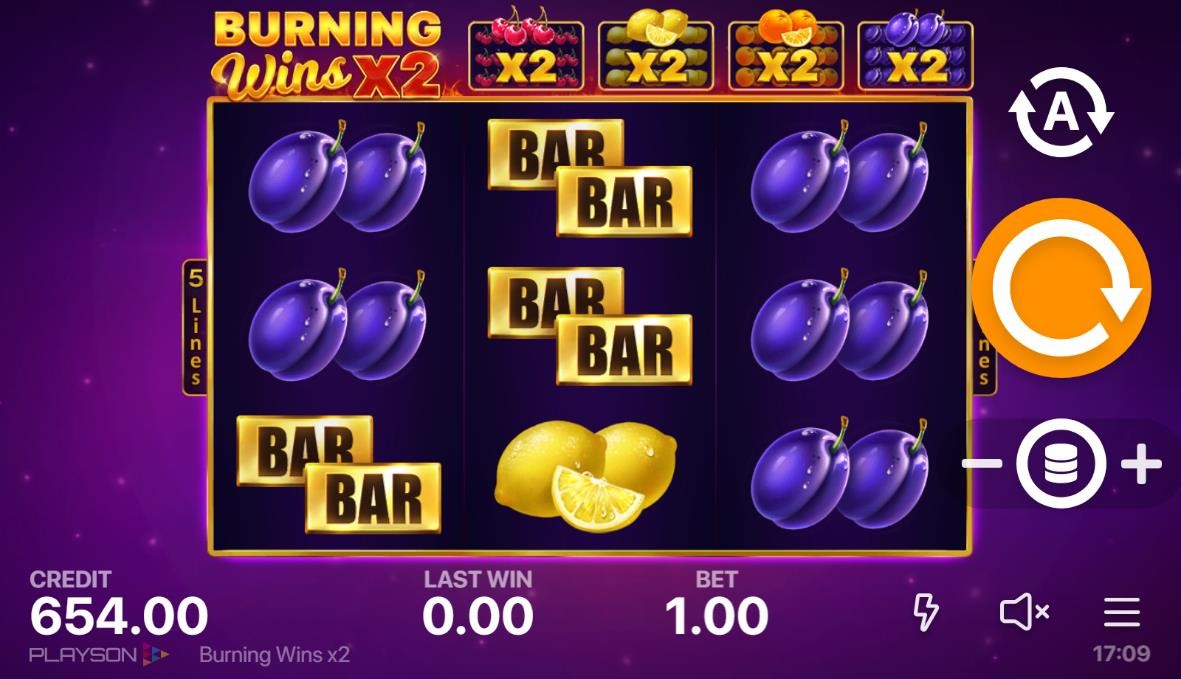 Burning Wins x2 cuenta con una sabrosa cesta de frutas en el centro. La mitad de los símbolos aparecen como frutas fotorrealistas listas para ser recogidas: cerezas, naranjas, limones y ciruelas. La otra mitad está formada por sietes rojos, campanas y lingotes como símbolos de pago alto, así como X como símbolo de pago más bajo.