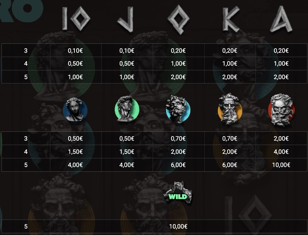 Los premios de los símbolos mostrados arriba reflejan el nivel de apuesta seleccionado en estos momentos. El premio teórico de este juego es del 96.18%. El RTP fue calculado simulando 10.000.000.000 de rondas.