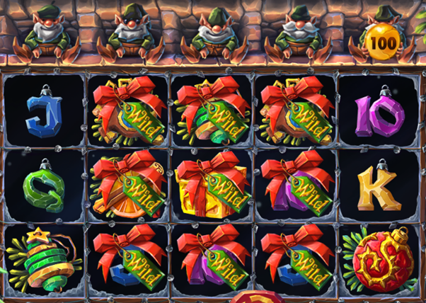 - La función de la golosina que conservan los duendes ayudantes sobre los rodillos se activa cuando un símbolo Wild aparece aleatoriamente en el rodillo inferior.