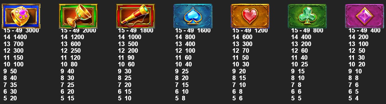 Todos los símbolos pagan en bloques de mínimo 5 símbolos conectados horizontal o verticalmente.