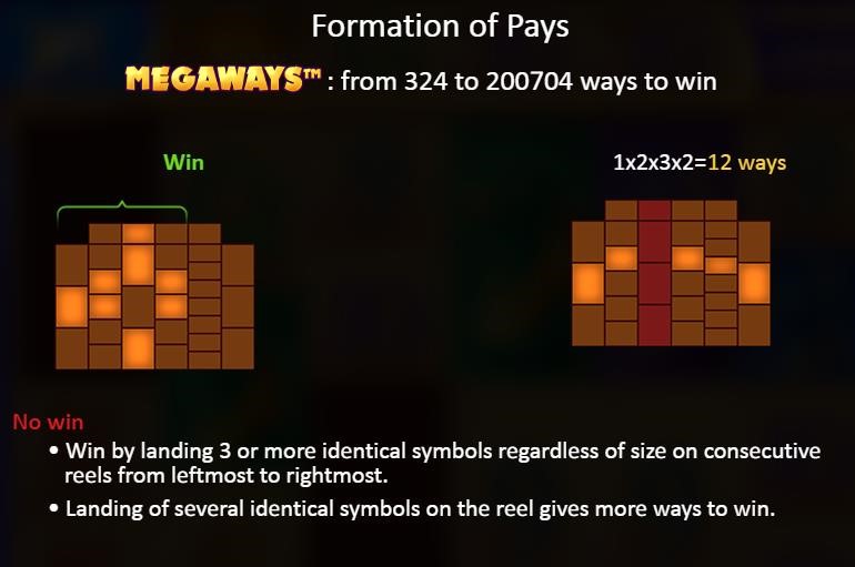 Cada jugada puede tener hasta 200 704 formas de ganar. Para ganar, hay que conseguir 3 más símbolos idénticos, independientemente de su tamaño, en rodillos consecutivos del extremo izquierdo al derecho. Cada jugada genera un número aleatorio de símbolos del 2 al 7 en los rodillos 1-6.