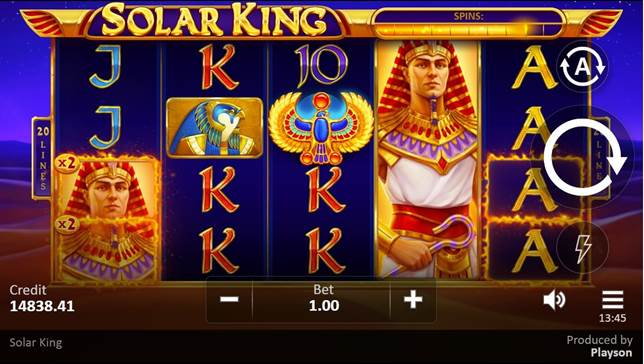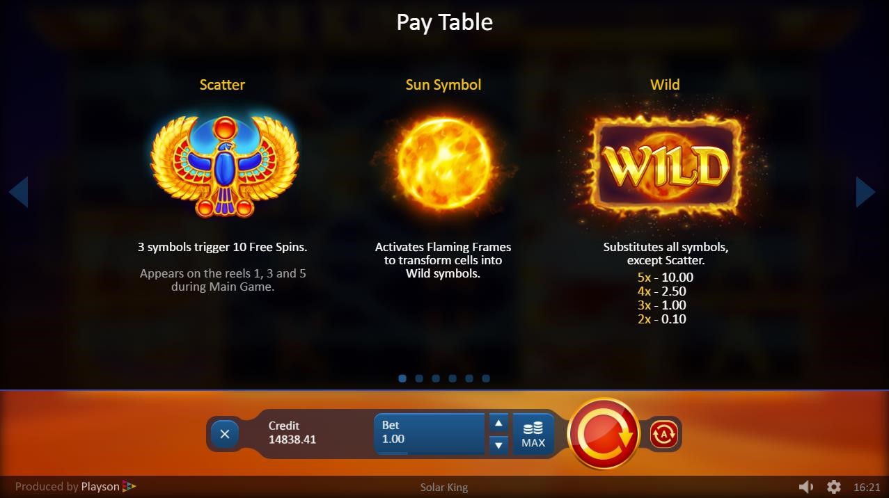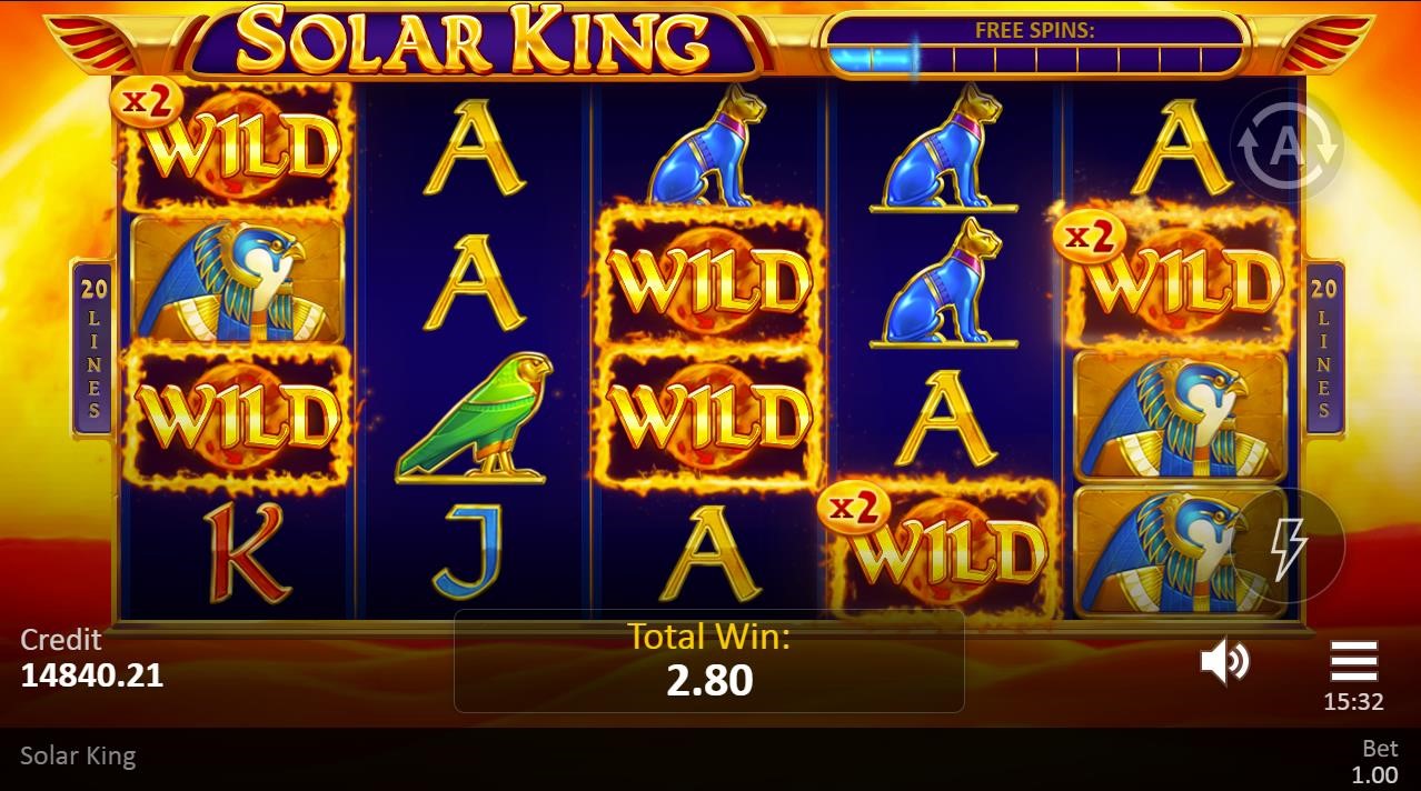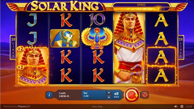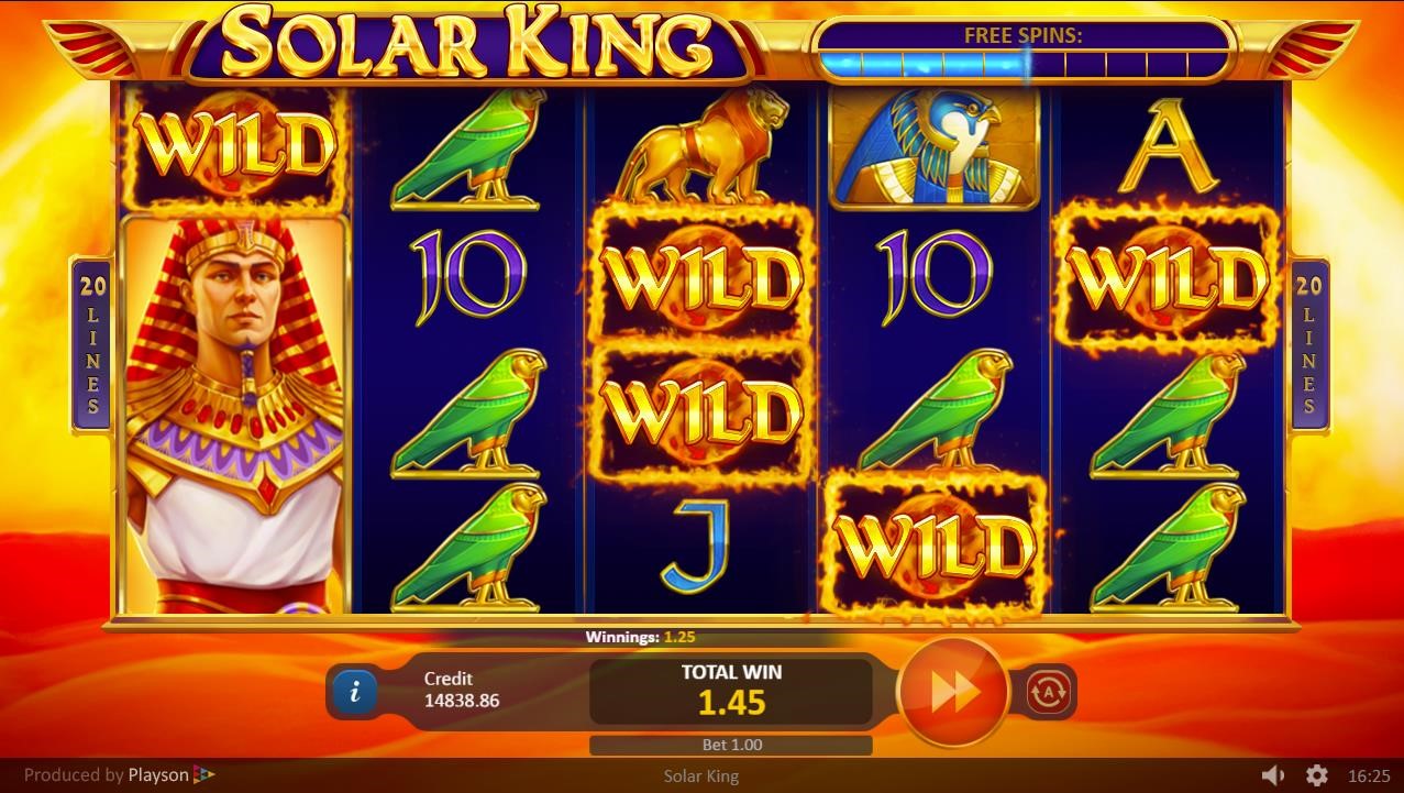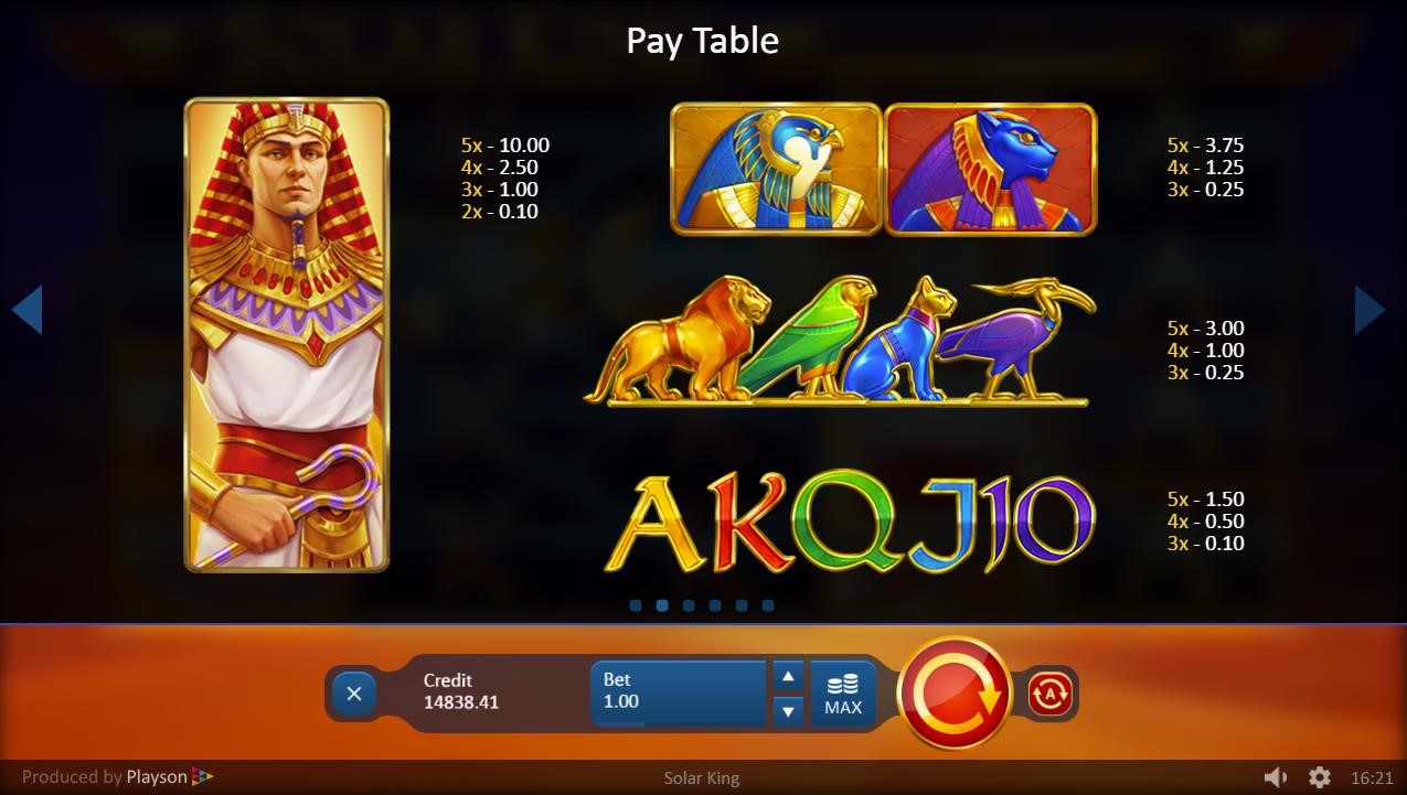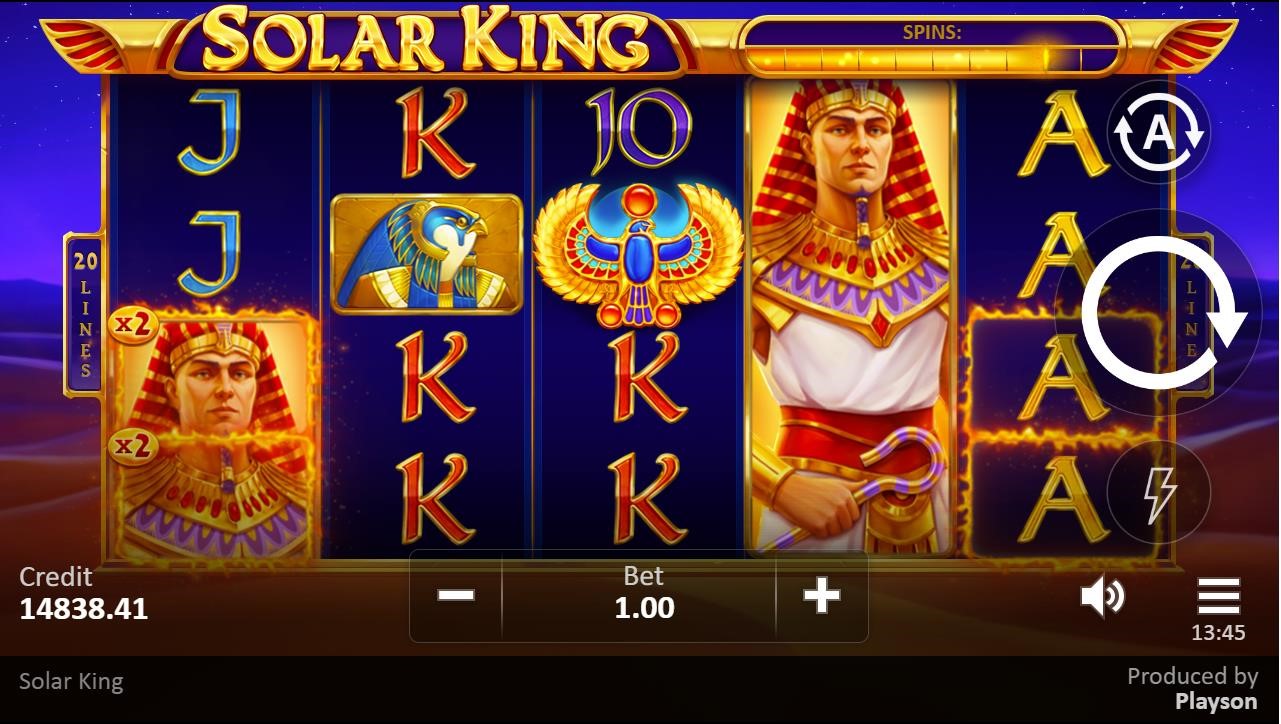 El juego de tragaperras «Solar King» de Playson muestra el misticismo del Antiguo Egipto con todas sus bellas ilustraciones y banda sonora. El gran gobernante de Egipto se muestra como un símbolo de pila. Es el símbolo de pago más alto. Los patronos divinos del faraón, Ra y Bastet, también son símbolos de pago alto. Otros símbolos especiales son el Símbolo de Sol, el Pájaro de Ra, el símbolo de Scatter y el símbolo de Wild. El último aparece resaltado con una animación en llamas. Durante el modo de Jugadas Gratis, el fondo cambia de la tranquila noche del desierto al gigante amanecer que lo consume todo. En lo más alto, el sol brilla sobre la animación de Grandes Ganancias con la lluvia de monedas de oro.