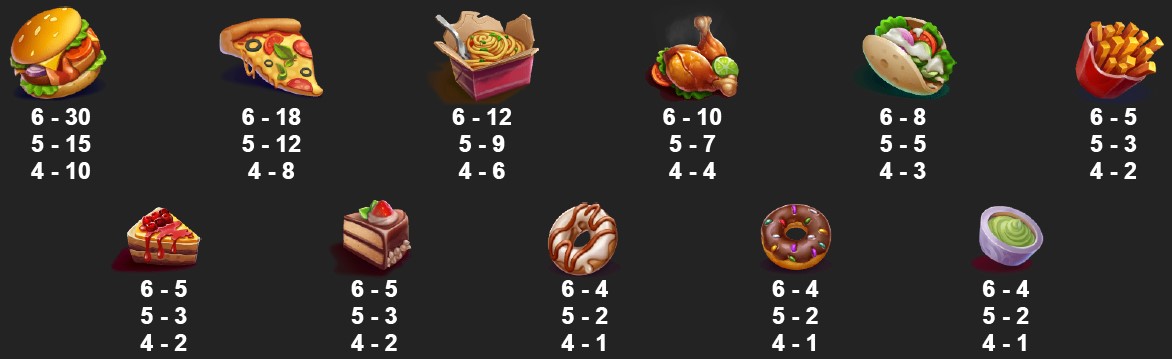 El rodillo 1 y el rodillo 6 contienen 4 símbolos, los rodillos 2 a 5 contienen 6 símbolos. En total, el número máximo de posibles vías de premio es 16.384.